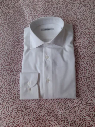Camisa de vestir blanca, ideal para cualquier ocasión. Confeccionada en 100% algodón. Nueva sin sacar de su embalaje. Talla 48. Para una talla M - Cuello clásico. - Cierre de botones. - Puño con botón.