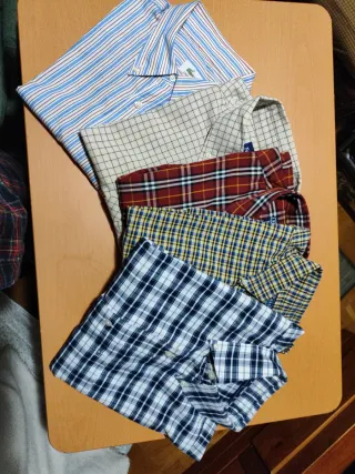 Conjunto lote de camisas de vestir con diferentes estampados de marca. Están en muy buen estado y sin ningún tipo de desgaste o manchas. 40€ por las 5 camisas o 10€ por cada una. - Camisa Ralph Lauren de cuadros azul marino y blancos. Manga larga. -Camisa Ralph Lauren de cuadros amarillos y azules. Manga larga. - Camisa Ralph Lauren de cuadros burdeos y amarillos. Manga larga - Camisa Ralph Lauren de cuadros beige. Manga corta. -Camisa Lacoste de rayas azules, blancas y rojas. Manga corta.