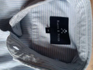 Camisa de manga larga con un diseño de rayas finas. Perfecta para un look casual o formal. Camisa de rallas manga larga. Marca Harper Neyer. Talla M. Pequeña mancha de lejía en la manga derecha (se ve en la última fotografía). - Cuello camisero. - Cierre de botones. - Logo bordado en el pecho.
