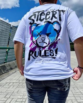 Camiseta oversize con estampado gráfico de oso y texto. - Diseño Street Rules en la espalda. - Estampado de oso azul con detalles morados. - Frase If you obey all the rules you miss all the fun.