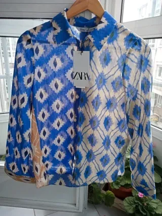 Camisa estampado jacquard, en tonos beige, azul y marrón. Manga ancha, cierre con botones. Composición: 100% algodón. Largo: 62cm, hombros: 35cm, sisa: 46cm. Es una XS, pero también vale para una talla S