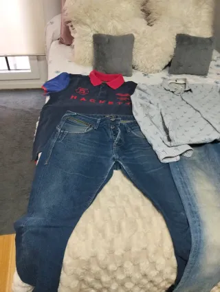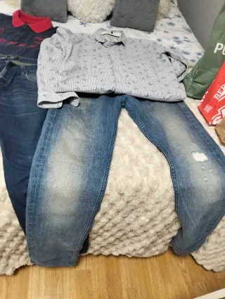 Conjunto de dos pantalones vaqueros para hombre. - Pantalones de marca original. - Diseño desgastado y con rotos. - Tono azul clásico.Camiseta de marca y camisa,está todo perfecto,no envioTODO por30euros.