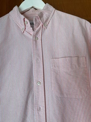 Camisa de estilo Oxford con un diseño de rayas verticales en tonos rosas y blancos. Es una prenda clásica y versátil. - Cuello abotonado. - Bolsillo en el pecho.