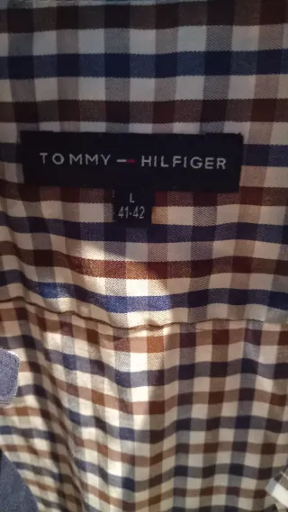 Camisa de cuadros de la marca Tommy Hilfiger. - Diseño a cuadros en tonos azules y marrones. - Talla L (equivalente a 41-42). - Cuello clásico....10e cada una.....de hombro a hombro 48ctrs..torso 52ctrs.