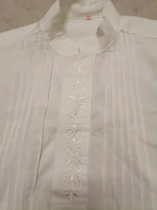 Camisa blanca de talla 37, ideal para fallas, detalles en bordado gris plata - mide de largo manga 55-57, ancho hombro a hombro 42-44. - Cuello mao con bordado. - Delantero con pliegues y bordado. - Cierre de botones.
