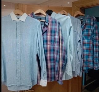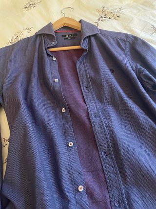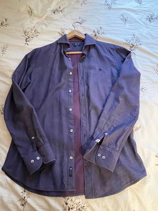 Conjunto de cinco camisas para hombre. - Camisa de rayas finas en azul claro. - Camisa de cuadros en tonos azules, morados y rosas. - Camisa lisa en azul claro. - Camisa lisa en azul grisáceo. - Camisa de cuadros en azul y rojo. Lote de cinco camisas entre la talla L y la XL.. la camisa de la marca altonadock tiene un poco estropeado el cuello se puede ver las fotos,pero está francamente todos muy bien. Marcas como: Zara,Pull&bear, Formula Joven,Altonadock y Springfield... Me interesaría venderlas todas de un tirón y así hago espacio en el armario de ahí el precio tan barato... Envío preferente por INPOST