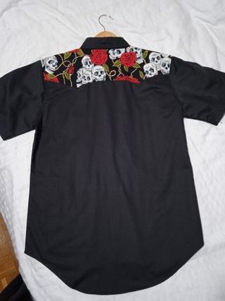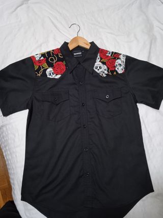 Camisa de manga corta con un llamativo diseño con calaveras y rosas. Banned alternative skulls & roses