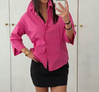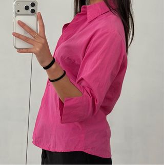 Camisa rosa de corte amplio y moderno. - Cuello camisero clásico. - Mangas semilargas con abertura. - Está cortada la etiqueta, yo uso la S y me gusta porque queda overside, diría que es M para llevar más ajustada