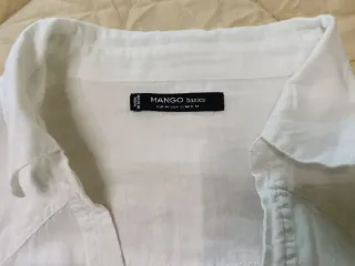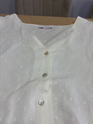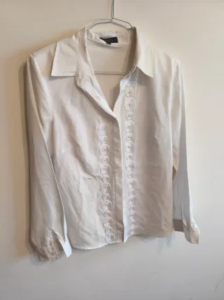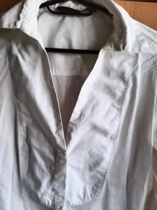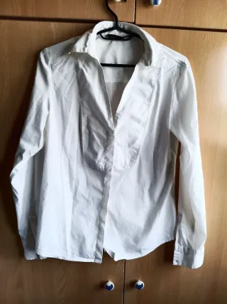Camisa blanca de tejido fino, ideal para un look ligero y fresco. Aunque es M pongo para S porque queda mejor, también vale XS. Para M sería de poco pecho y que No tenga brazos gorditos porque quedaría muy justa, qué es lo que me ha pasado a mí!!! - Diseño con botones frontales. - Dos bolsillos en el pecho con detalle. - Mangas largas. No tiene desperfectos!!!