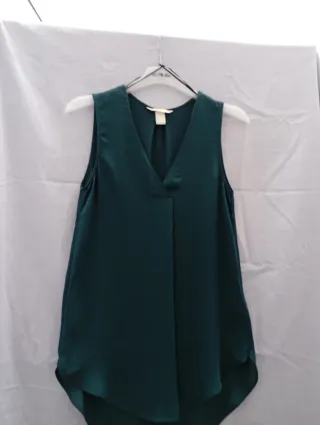 Camisa de vestir sin mangas para mujer, con un elegante diseño. - Marca: H&M - Talla: S - Color: Verde - Material: Poliéster - Cuello en V - Sin mangas - Bajo asimétrico