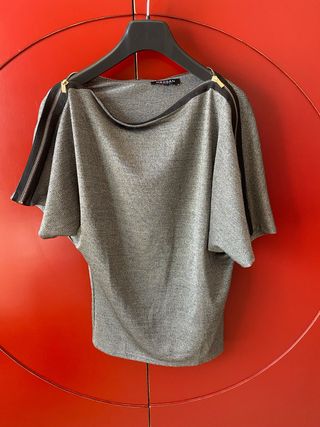 Camisa de manga corta con un diseño moderno y detalles de cremalleras. La talla corresponde a una S - Cremalleras doradas en los hombros. - Cuello redondo. - Tejido ligero y con brillo.