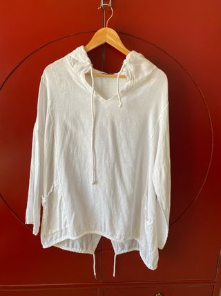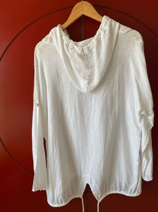 Camisa de lino con corte oversize, perfecta para un estilo relajado y fresco. - Diseño con capucha. - Cordones ajustables en la capucha y el bajo. - Bolsillos frontales. - Manga larga.