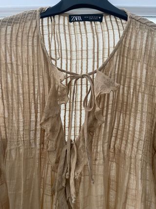 Camisa volantes con bordados Zara. Cuello redondo. Manga larga terminada en puño elástico. Cierre frontal con aberturas y lazadas. Color camel. Talla M. Puesta una sola vez, en perfecto estado