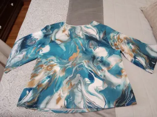 Camisa de mujer con un diseño abstracto y moderno, ideal para la entretiempo. Su estampado fluido combina tonos vibrantes. - Mangas acampanadas. - Cuello redondo.