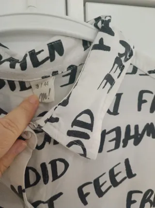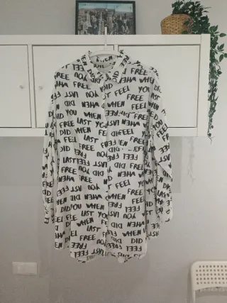 Camisa de manga larga con estampado de texto en blanco y negro. 66 cm sisa y 84 cm largo. Hago envíos. Bolsillos laterales. - Diseño con palabras repetidas. - Cuello camisero. - Cierre de botones.