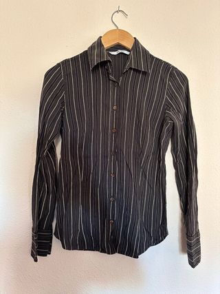Camisa de rayas finas en tonos grises. Cuello en pico y cierre de botones. Talla S. Marca Okeysi.