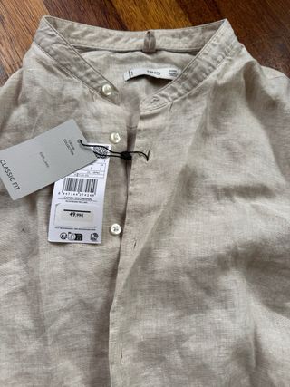 Camisa de manga larga con cuello mao y cierre de botones. Es talla s de hombre o m de mujer. De mucha calidad, me costó 50€, era un regalo para mi chico pero le está muy justa, ha sacado barriga jeje - Confeccionada en 100% lino. - Diseño ligero y transpirable.