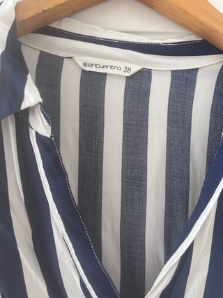 Camisa de rayas verticales en tonos azul marino y blanco. Presenta un cuello camisero y cierre parcial de botones. - Diseño de rayas verticales. - Cuello camisero. - Cierre de botones en la parte delantera.
