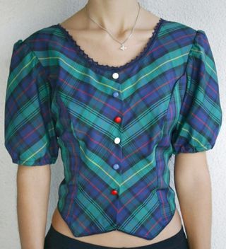 Camisa de cuadros con manga corta bombacha o abombada de colores rojo, verde y azul con botones y bordado en los extremos, estilo vintage, retro o antiguo. Talla M 38 - L 40, adjunto las medidas para mayor orientación. En muy buen estado. Queda preciosa y favorece mucho. Medidas : Largo 51cm Pecho 46'5cm Cintura 43cm. Sí hago envíos, sólo VÍA WALLAPOP. Cualquier duda, preguntar sin miedo. Pásate por mi perfil a echar un vistazo :)