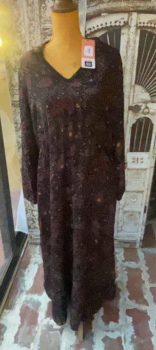 Camisa Blanca Con Corazones Talla L Nueva Vale 3---- Vestido largo de manga larga con un estampado floral en tonos grises. El diseño es holgado y con varias capas.Vale 4------