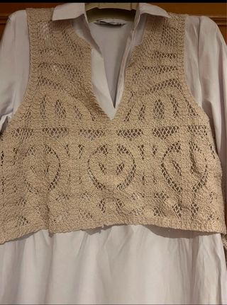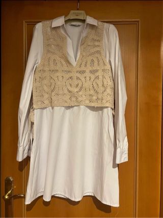 Vestido mini de Stradivarius con un diseño de crochet sobre una base de camisa blanca. - Parte superior de crochet con un intrincado patrón. - Base de camisa de manga larga. - Largo mini.
