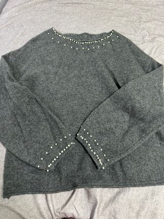 Conjunto de tres prendas de vestir. - Camisa azul con cuello - Chaleco gris de punto - Jersey gris con detalles de perlas