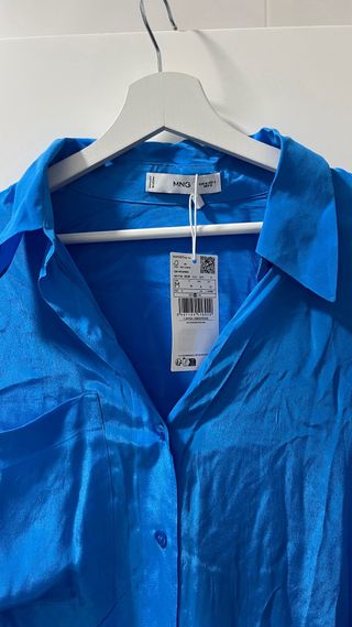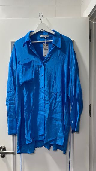 Camisa estilo vestido de Mango, con un vibrante color azul. - Diseño de manga larga. - Cuello camisero. - Cierre de botones. - Bolsillo en el pecho.