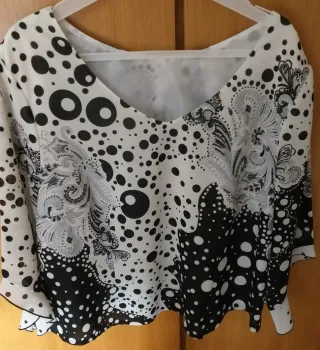 Prenda versátil que puede usarse como camisa o vestido corto. Su tejido brillante le da un toque especial. Talla s/m - Diseño con escote. - Mangas cortas. - Bajo elástico.