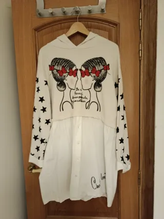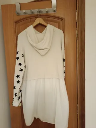 Vestido de la marca Anabel Lee. Nuevo, se ha usado una vez, ya que me equivoqué de talla - Estampado de estrellas en las mangas. - Parte inferior tipo camisa. - Cuello con capucha.