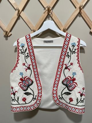 Elegante chaleco con un diseño floral bordado, perfecto para combinar con camisas o vestidos. Solo se ha usado una vez. - Diseño multicolor con bordados de flores. - Acabado en blanco. - Lo vendo porque me va pequeño.