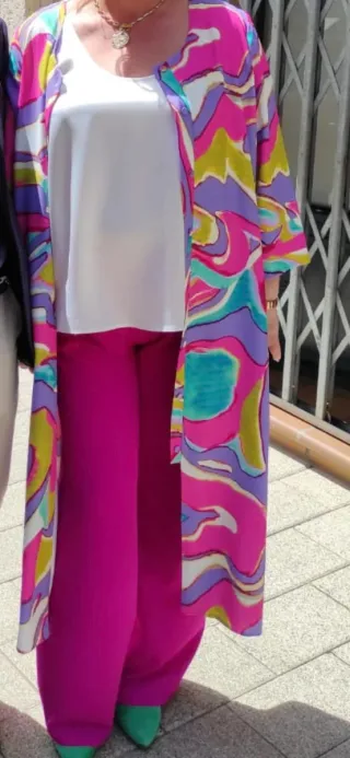 Conjunto de tres piezas para mujer con un llamativo estampado. - Chaqueta larga con estampado abstracto se utiliza sola de vestido - Pantalón de corte recto Camisa hombros lencera blanco