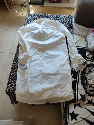 Camisa de Zara sin utilizar. Talla XS pero da muchísima talla, sirve para XL también. Cómo es larga puede servir también de mini vestido. Tiene mangas abullonadas y vuelo atrás.