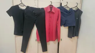 - Camisa con rayas finas blancas sobre fondo oscuro. 10€ - Camisa con pequeños puntos blancos sobre fondo azul marino. 10€ - Abrigo largo de invierno acolchado talla L. 30€ - Chaqueta de lana gris. 30€ - Chaqueta marrón. 30€ - Chaqueta de entretiempo beige. 20€ - Vestido largo marrón. 20€