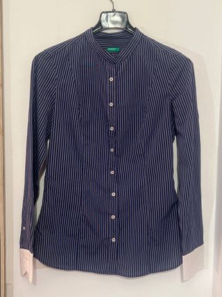 Camisa Benetton cuello mao rayas talla 38 Camisa de vestir con cuello mao y estampado de rayas verticales. - Diseño entallado. - Puños de manga en color rosa pálido. - Cierre de botones blancos.
