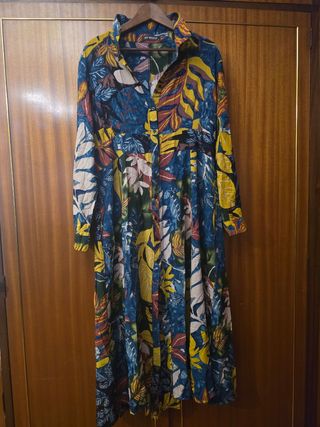 Precioso vestido largo de la marca Menglu, talla XL. Es de color multicolor con un estampado de hojas muy llamativo. - Diseño de camisa con botones. - Manga larga. - Corte amplio y fluido. - Ideal para cualquier ocasión. Cambio de armario y me ocupa sitio, la tengo poco tiempo a la venta. Si no la vendo la dono. Si te interesa no esperes ;) . Hago oferta por pack.