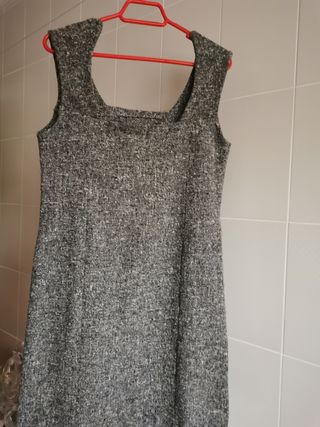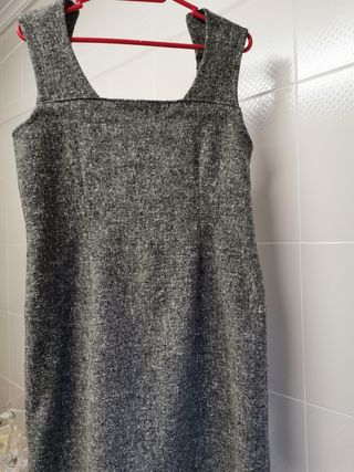 vestido gris oscuro sin mangas. puedes combinarlo con una camisa o jersey fino debajo o sin nada. talla s-m