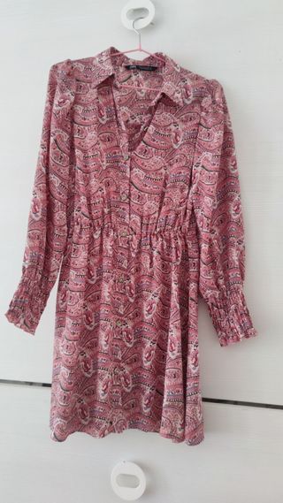 Vestido midi rosa con estampado de Zara - Manga larga con puño tipo nido de abeja. - hombro abullonado, muy favorecedor - Cuello de camisa. - Cierre de botones joya. - Detalle de fruncido en la cintura. - Tejido ligero y fluido.