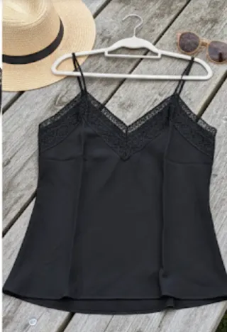 top lencero de tirantes en color negro, ideal para un look elegante o de noche! El tejido tiene un detalle de textura de pequeños puntos (plumeti/jacquard) que le da un toque muy especial y sofisticado. Detalles de diseño: Escote en "V" y bajo decorados con un delicado encaje de pestañas (eyelash lace) que se ve muy femenino.Perfecto para llevar bajo una blazer o solo con unos pantalones de talle alto.