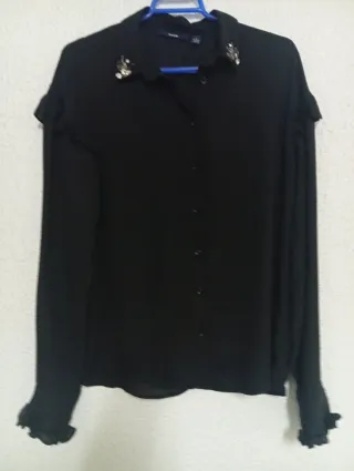 Camisa negra de Zara con un diseño clásico y elegante. Un básico - Cuello camisero. - Manga larga. - Tejido con textura suave y con mucha caida - Medidas: 110 cm de contorno de pecho y 65cm de largo