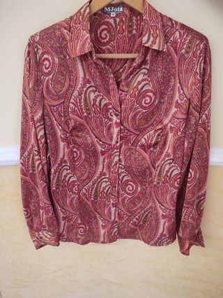 Preciosa camisa estampada de mujer en tonos rojizos, marrones y beige, cierre abotonado, talla 48, pequeña