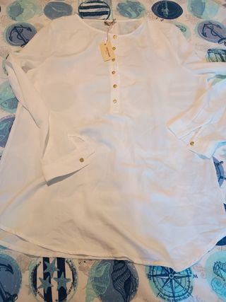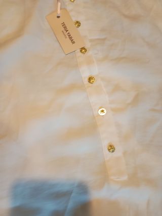 Preciosa camisa de la marca Teria Yabar, sin estrenar. Es de color blanco roto y tiene un diseño elegante y sencillo. - Talla: (Añadir talla) - Cierre de botones dorados - Manga larga - Tejido ligero