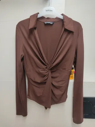 Camisa ceñida de licra en color marrón chocolate, de Stradivarius, talla M. Escote en pico favorecedor y tejido elástico. Perfecta para looks básicos y elegantes.