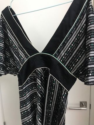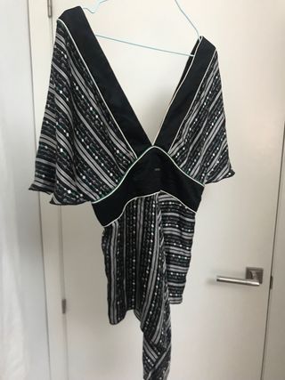 Camisa elegante con detalles únicos. - Diseño con encaje negro en la parte superior y mangas. - Bolsillo decorativo con lentejuelas doradas. - Cuello redondo con detalle de pedrería manga francesa me queda pequeña como nueva
