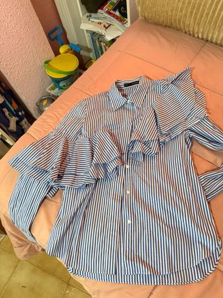 Camisa de Zara con un diseño moderno y elegante. - Color azul con finas rayas blancas. - Detalle de fruncido en la parte delantera. - Mangas largas con puños. - Cuello camisero. - Tiene una pequeña mancha de perfume a la altura de los botones