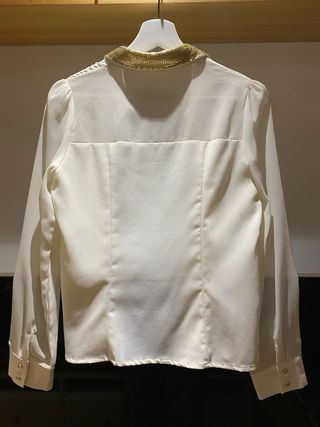 Elegante camisa blanca con detalles brillantes en el cuello. Zona superior ligeramente transparente - Cuello adornado con pedrería dorada. - Botones frontales dorados. - Mangas largas abullonadas.