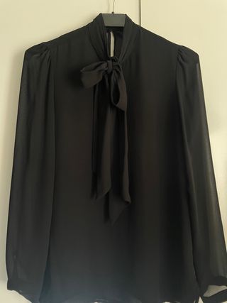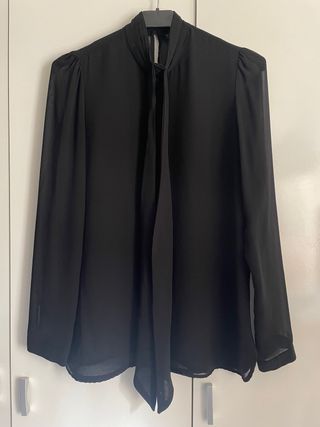 Elegante camisa transparente de Zara. - Diseño con lazada al cuello. - Mangas largas con botón en el puño. - Tejido ligero y vaporoso. - “Forro” en la parte delantera para que no transparente tanto. - Dos botones en la espalda para abrocharse. - Talla S.