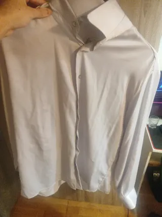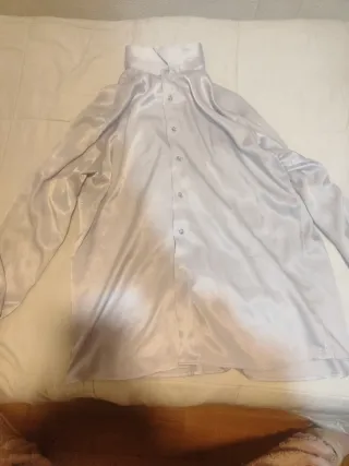 Elegante camisa de seda con cierre de botones. la vendo por que me queda grande y me la he puesto 2 veces, como se ve en las fotos hay un boton que cambie yo por que se me perdio lo demas esta perfecto, original y precio negociable
