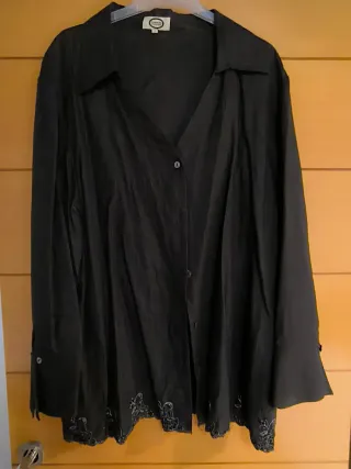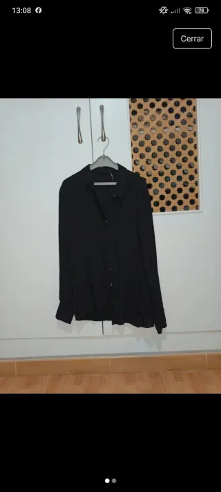 Camisa negra de manga larga, ideal para el verano. Presenta un diseño elegante y ligero. Solo hay que plancharla está arrugada de estar guardada - Cuello en V. - Cierre de botones. - Dos bolsillos en el pecho