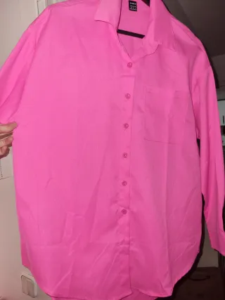 Camisa de corte oversize con un vibrante color rosa. - Diseño de manga larga. - Cuello camisero clásico. - Cierre de botones en la parte frontal. - Bolsillo en el pecho. Medidas: de sisa a sisa 56 cm de hombro a hombro 47cm. Largo parte trasera 74 cm , y parte delantera 70cm