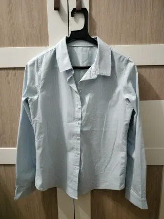 Camisa de rayas finas en tono azul claro, ideal para un look casual o formal. - Cuello camisero clásico. - Cierre de botones en la parte frontal. - Mangas largas.